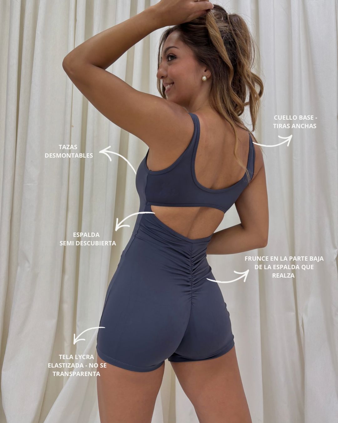 Pieza entera confeccionada en lycra premium, tejido liviano y elástico que se adapta perfectamente al cuerpo. Su textura es ultra suave y el calce acompaña cada movimiento sin apretar ni molestar. Posee una costura trasera que realza la silueta y parte superior con tazas desmontables.